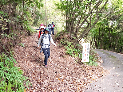 | 鉄塔を過ぎ、細い山道をくねくね歩いて 舗装路に出た 12:05 この舗装路を歩いて行けば、大駐車場に着き そこから車道を少し歩いて行けば入鹿池になる ・・・と安心したのだが、 進入禁止のチェーンをまたぐ際、 足が引っかかって転倒し、膝を痛めた怪我人が発生! 痛み止めの薬と、テーピングテープと、 膝サポーターを幾つも巻いて出発 入鹿池で休憩の後は、本宮山を登って下りる計画だが 怪我人には無理 山の麓の道を歩いて大県神社まで2人で歩き、 そこから車組の人に家まで送ってもらうよう頼んだ 他の15名の中に、周回したことのある経験者が二人いたので 案内をお願いした |