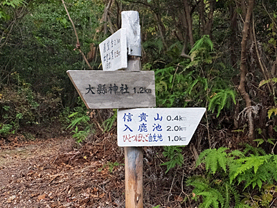 | 奥宮の後ろへ行って、休憩 11:00〜11:10 あちこちに座れる石が置いてあるが 木に隠れ展望はなし ここから急な山道を下りるコースもあるが、 |