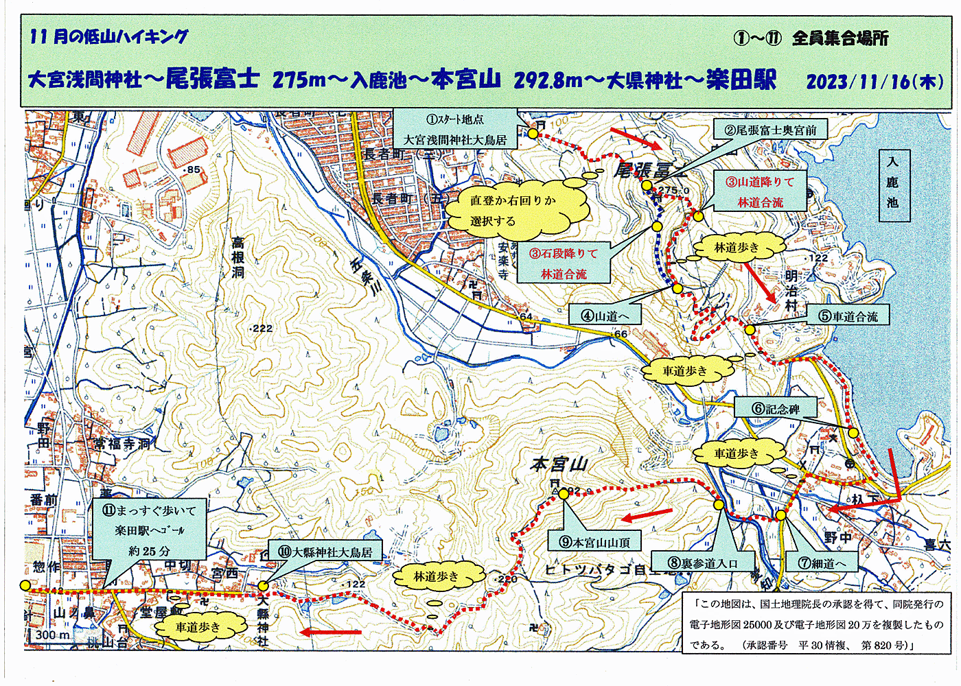 | 多治見駅発 8:22発ー可児駅8:44着〜新可児駅8:57発 ―犬山駅9:17〜9:31ー羽黒駅9:34着 タクシー3台で(1台はピストン)大宮浅間神社へ 1730円〜1930円(予約代300円を含む) 合計5390円 12人のタクシー利用者で割って 1人分450円となった) 車組は、5名 (登山口と下山口に分かれて駐車したとか) タクシーは、1台ピストンの為、全員集合時間が遅れたが、 準備・ミーティングなどの後、 1012出発 (全員集合場所の@) |