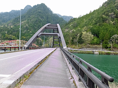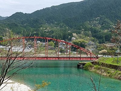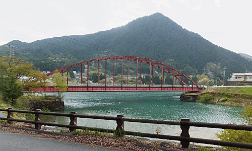 | 適当にショートカットしながら下っていくと、飛騨川に出る 立派な阿寺橋 左側の赤い橋は、「フォレスパ木曽」から 恋路峠や柿其渓谷方面へ行く橋 |