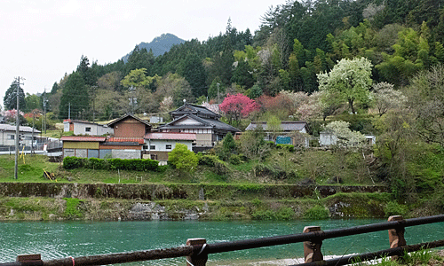 | 阿寺川沿いの道を進んでいくと、 青い色の川の向こうに家々 花もきれい〜 |