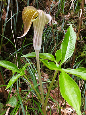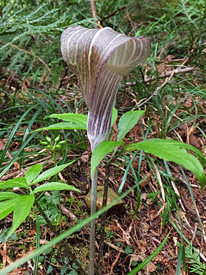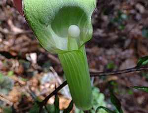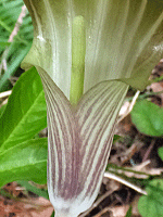 | マムシグサの仲間:サトイモ科 さっき、遊歩道で見た 紫色のマムシグサの仲間にまた出合った 右 ぺろりとした『仏炎苞(ぶつえんほう)』を めくるると、やっぱり細いまっすぐな棒 色は、黄緑色(さっきは、薄紫色だった) ここはこの紫色がフツーなのね! |