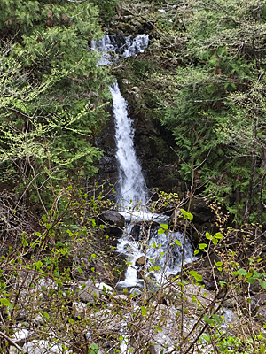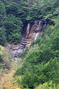 | 右側の急な山の斜面から 真っ直ぐに落ちてくる小滝 |