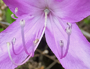 | トウゴクミツバツツジ:ツツジ科 さっきより色が薄いが、これもトウゴクミツバツツジ 雌しべの根元に、少しだがブツブツ(腺毛)がある |