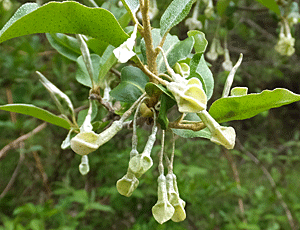 | グミの仲間:グミ科 高い木にたくさんつぼみがぶら下がっていた 白や黄緑の色 |
