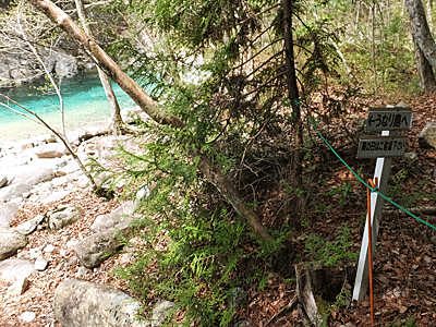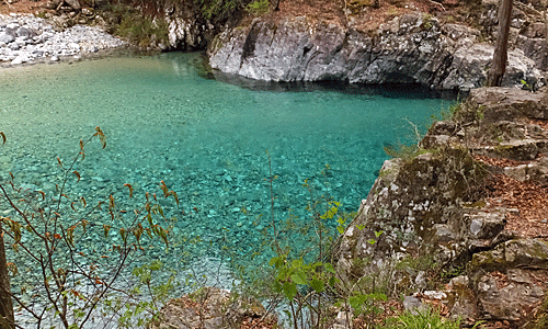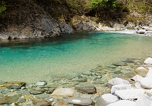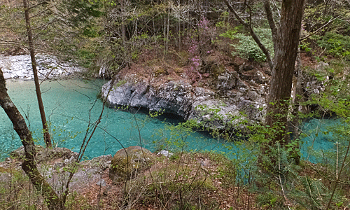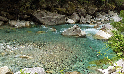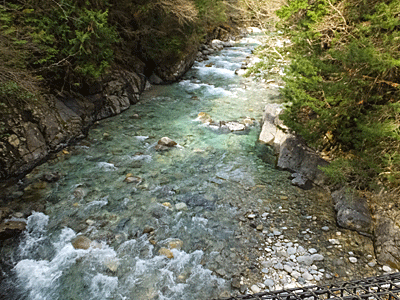 | 時々、木々の隙間から青色の川が見える 本当に澄んでいて、 流れが穏やかな所では、川底の石もくっきり見える |