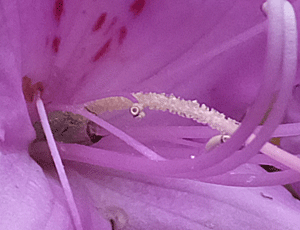 | 中を覗くと、 雌しべの根元にブツブツ(『腺毛』)があるので ↑ トウゴクミツバツツジ:ツツジ科 |