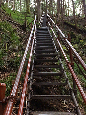 | 『滑ります 足元に注意してください』の文字 鉄板の階段なので、濡れていると滑る・・・ |