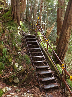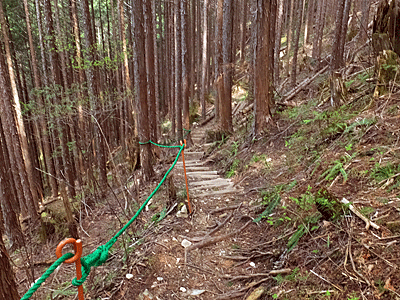 | 川を渡ると、スギ林の中の道を ジグザグに下りていくコースができていた |