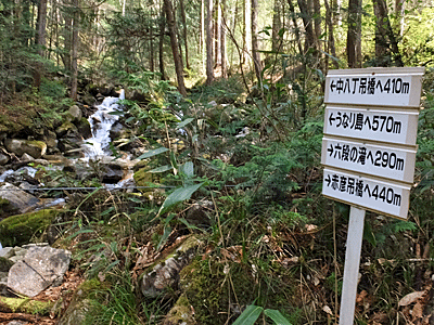 | 渡り切ると、こんな道標が立っていた ↑ 先回は、キャンプ場まで行くつもりだったので、 「六段の滝」はパスしてしまった |