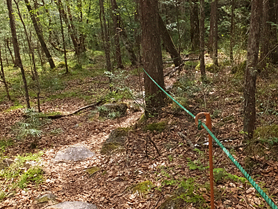 | 緑ロープをまたいで1歩・2歩進んでみたが、 下は滑りやすそうな場所になっているので止めて 元来た道から、下の河原へ下りることにした |