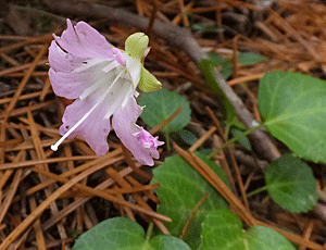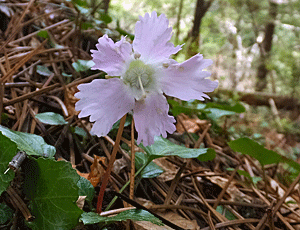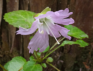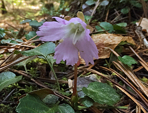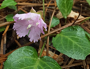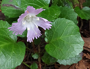 | イワウチワ:イワウメ科 葉っぱはたくさんあったが、見つけたのは 左 首吊り状態の花と 右 これはまあまあの2株だけだった 「うなり島」へ行ってよかったあ〜と、 つくづく好運に感謝 |
