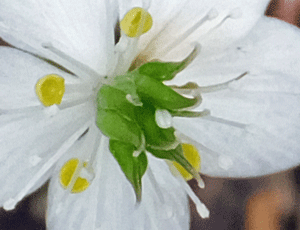 | ゴヨウオウレン(バイカオウレン):キンポウゲ科科 左側、花の様子 右側 雌しべと雄しべの拡大 白い花びらのような部分は、萼 黄色い小さなものが、花びら 花の中央にある緑色の部分が雌しべ 白くて細い部分が雄しべ 一番下 花の真ん中に赤い点がある!? 何だろう? |
