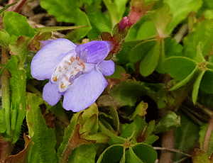 | ムラサキサギゴケ:ハエドクソウ科 つる状になった茎を伸ばすのが特徴 そっくりさんでツルが無いのは、トキワハゼ |
