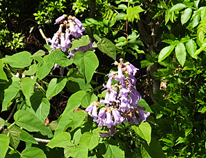 | キリ:シソ科 川(不動川)の向こう岸に紫色の花 望遠で撮ってみると、キリの花だった |