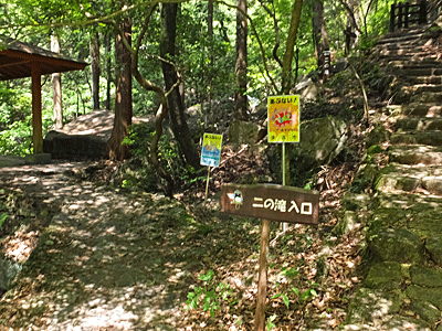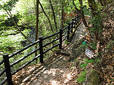 | 「二の滝」の上に、赤い橋 あの橋を渡って登っていく |