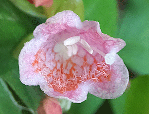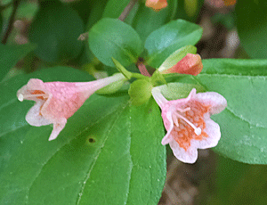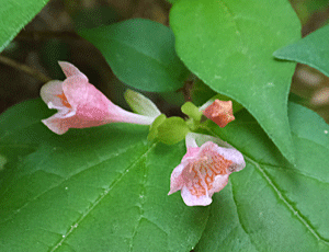 | コツクバネウツギ:スイカズラ科 萼は2枚(ツクバネウツギは5枚) 花色は、ピンク系とオレンジ系がある |