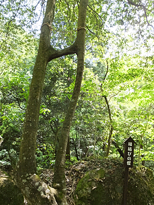 | 滝のそばにある「縁結びの樫」の樹 ↑ 2本の樹がくっついていることからの命名と分かる |