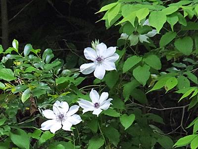 | クレマチス:キンポウゲ科 川(不動川)の向こう岸、「梵天の滝」の横に 白い大きな花が見えた 望遠で撮ってみたら、クレマチスだった 園芸種の花が山の中に咲いているとは… 鳥が種を運んだのだろう |