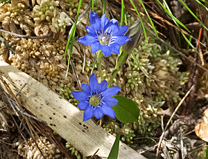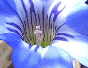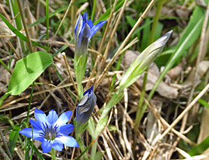 | ハルリンドウ:リンドウ科 下段左 中央から右の方に長いつぼみのようなものがあるが これは、花の終わった様子 これから種を作る準備が始まる所 でも、下段右は、雄しべが捩じりあっているので まだ咲いたばかり |
