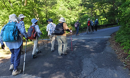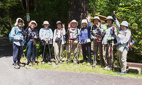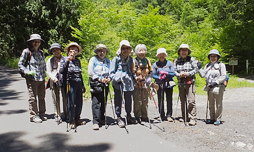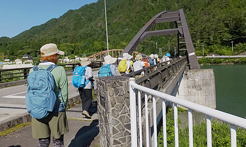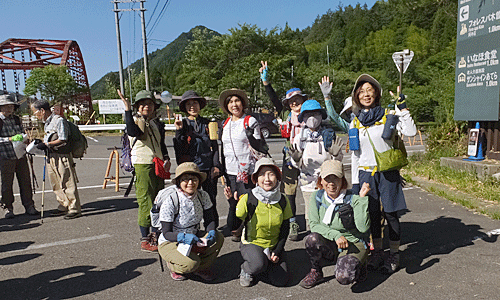 | 2つ目の吊り橋を渡った舗装路の所で、 先に出発していた3人と一緒に Aグループ全員で集合写真 時々、左手を流れる阿寺川をのぞき込んだり 説明板を読んだりしながら 遊歩道出発点へ この先は、来るときに歩いてきた道 朝の道は日陰で涼しかったが、 帰りの道の日向はジリジリ おまけに土曜日のせいか、車が多い! 今の車は音もなく近くまで来るので、 ビックリさせられる |