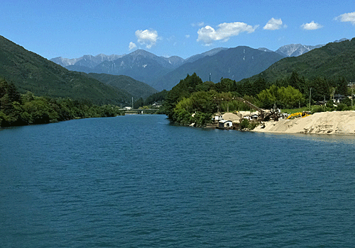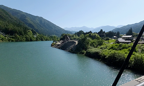 | 阿寺橋の上からの展望 蒼っぽい水の色が阿寺川の色と似てきた・・・ 朝は緑色っぽかったのに 野尻駅14:10頃着 全員、14:30発に乗車できた ・・・・・・・・・・・ |