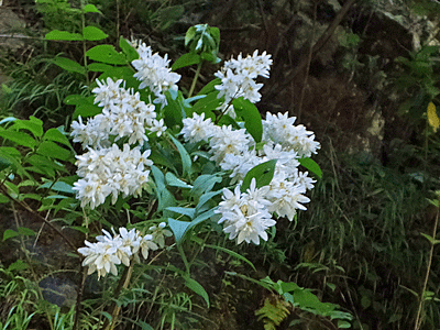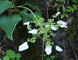 | イワガラミ:アジサイ科 ↑ ツルになっていて、白い装飾花は1枚 阿寺渓谷は、イワガラミの方が多かった そっくりさんのツルアジサイ:アジサイ科は 装飾花が4枚 ↓ |