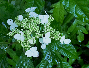 | コアジサイ:アジサイ科 梅雨時の花で雨が似合う これは、青色が濃い方 もっと白っぽい花もある |