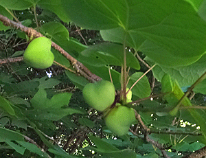 | アケビ:アケビ科 長径2〜3cmの実がなっていた 花がたくさん咲いていても、 実になるのは、ほんのちょっぴり |