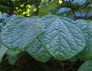| マルバノキ(ベニマンサク):マンサク科-2 実は、丸くはない いびつな形 どちらかと言えば、ハート形 下右は葉っぱの様子 水が滲み出したように見え、水玉もできることがある 周りにある他の葉っぱでは、こんなことはない 秋の紅葉も美しい |