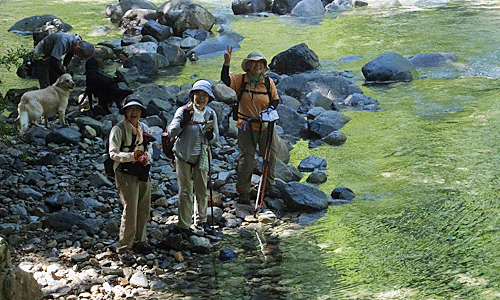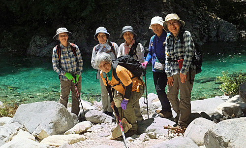 | この河原を11:50に出発することにして 慌ただしく飲んだり食べたり このきれいな色の川をバックに 写真を撮ってから出発〜 |