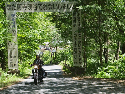| 「ようこそ阿寺渓谷へ」の門を潜る |