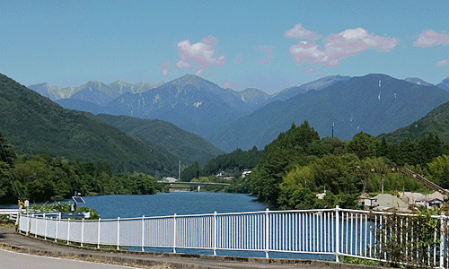 | 阿寺橋の駐車場からの展望 ここで車組とお別れ 朝よりうんときれいに中央アルプスが見えた |