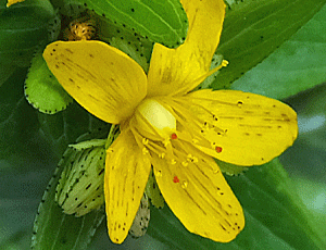 | オトギリソウの仲間:オトギリソウ科-2 上の-1とは、なんとなく感じが違う 黒点と黒線と赤い点はそっくりだけど・・・ 花びらが細め・葉っぱの筋も違うタイプ |