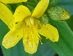| オトギリソウの仲間:オトギリソウ科-1 花びらにも、萼・葉っぱにも黒点と黒線がある 赤い点は雌しべかと思ったら、 『雌しべは1個、花柱は3個』だって オトギリソウの仲間はいろいろあって、 名前の同定は難しい 『オトギリソウ・シナノオトギリ・コケオトギリ・ イワオトギリ・ヒメオトギリ・コゴメバオトギリ・サワオトギリ』・・・など、 そっくりさんが多いので困る ↑ これは葉っぱの筋がくっきりあるタイプ |