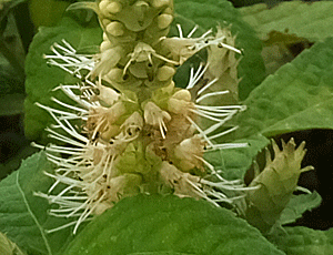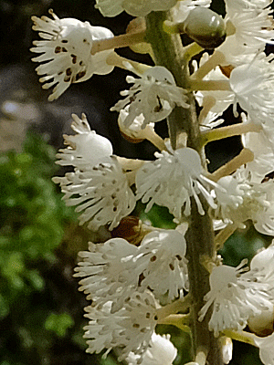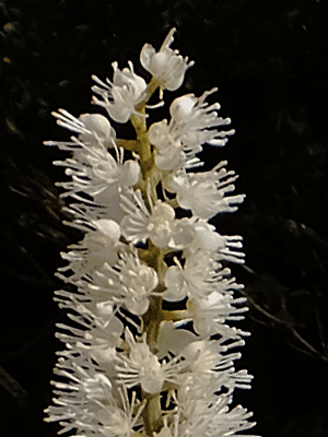 | サラシナショウマ:キンポウゲ科 右 花の拡大 『花弁状の萼片と花弁があるが、開花後すぐに落ちてしまい、 花には多数の白い雄しべがめだつ そのため、花序はブラシ状に見える』・・・と じゃあ、右の画像は、みんな雄しべ?? |