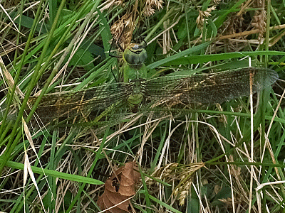 | 足元でバサバサッと音がした 何だろうと見ると、大きな緑色のトンボだった 『ギンヤンマのメスは全身が緑色』だとか じゃあ、これはメスだね こんな大きな緑色のトンボは初めて見た |