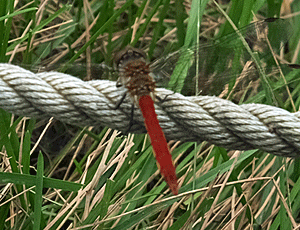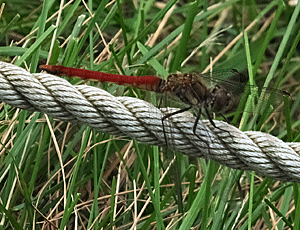 | トンボが避暑に来ているようで 空いっぱいに飛んでいた 同じロープで、20cm程離れた所にとまっていたトンボたち |