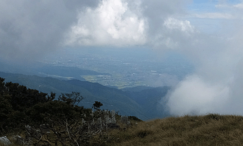 | 後ろを振り返った あの山頂の高みから降りてきた あっちは、青空が残っていた |