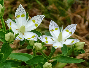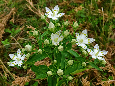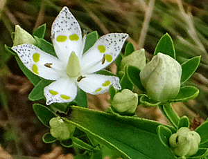| アケボノソウ:リンドウ科 今日のヒット! 咲きたてで初々しくてちょうど見頃 花びらの真ん中辺りにある緑色の丸いものは、『蜜腺』 その先に小さい点々が散らばっている この点々を『夜明けの星座』に見立てた・・・とか |