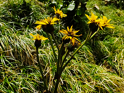 | マルバダケブキ:キク科 鹿ネットの向こうに大群生地があるのだが 今はもう枯れた葉っぱばかりだった この株だけ、まだ咲いていた この辺りに、トリカブトの群生地があったのに なあ〜んにも姿なし!! |