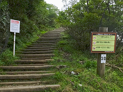 | さあ、東登山道へ ずっと以前は、静かで花いっぱいの道だったが だんだん花が少なくなってきた ざっと見渡しても花の姿なし・・・ |