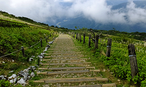 | この階段を降りると駐車場 13:48 階段を登って左は、東登山道 右は、中央登山道 これで3本の道をすべて歩いた 花の種類が多いのは、西登山道だが、人が多い 岩や石ゴロゴロの道で歩きにくい 東登山道は、人が少なく静かで長い 中央登山道は階段ばかり サラシナショウマとテンニンソウの群生地がある 駐車場発着なので、 どこかの道を2回歩かなければならない |