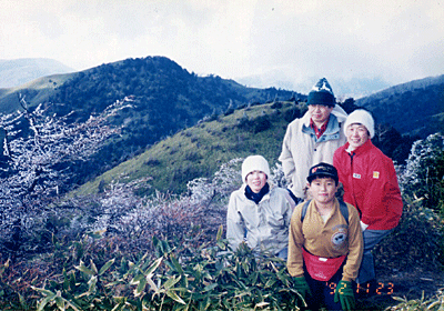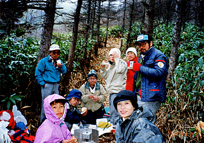 | ここからは急な登りもない、たらたらの快適な尾根歩き。 2番手のメンバーに「あまり近付くとせきたてられるので、適当な距離を取って」 と言ったせいか、それとも早すぎるせいか間が聞くのでゆっくりゆっくりと歩を進める。 雲は段々と雪雲のようになって、風と一緒に白い物が舞うようになってきた。 「もしかして、これは雪?」といいながらアップダウンを繰り返す。 大川入山下の笹原の道で休憩。12:00。 ここからは頂上まで登りになるし、木がなくなるので風当たりは強くなるしで、 ヤッケを着ることにする。 ところが、ますます風は強くなり、雪もはっきりそれと分かるようになってきたので、 頂上アタックは諦めた方がいいと決め、ここで大休憩を取ることにする。 お湯を沸かし、熱いコーヒーとケーキで記念撮影。 その間も、寒くて寒くて鼻水は出そうになるわ、手はかじかむわでぶるぶる震えて いると、 ワーイ陽が差して来た。 頂上も青空の下に見える。 |