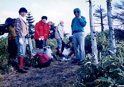 | 12:40発。 さっきとはうって変わった青空で、陽差しの強い中を歩くことにな ってしまった。 周りはきれいな笹の原。 ・・・と、しゃかしゃか音。 ん?と見上げると『えびのシッポ』 が風に吹かれて落ちてくる音だった。 先程のあの雪雲によって作られたらしい。 13:20頂上着。 |