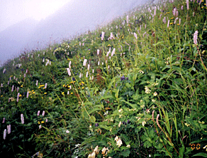 多治見10:08にちょうど列車が入ってきたのであれ???と思いながら乗ってしまった。 時刻表を調べたところ、何と14分後にも特急が出ているのである。 甲府からいつものバスで広河原へ。 甲府の駅前は信号が多くちっとも前進しない。 ちょうど「六科」の信号に出るパス道。南アルプス街道入口、15:00。 川の水は極端に少なく、泥水で濁っている。 谷川岳のハイキング事故があったばかりなので色が気になる。 山岳地帯に入ると、パスのスピードが速いので、車中からは花がよく見えない。 フシクロセンノウ・タマア ジサイ・カワラナデシコははっきり見える。 夜叉神峠、15:30。 トンネルを出ると雨が降っていた。雨脚も結構強い。 あ〜あ。山はガスの中。去年と同じく傘を差して広河原山荘へ。16:25毒。 今日はさすがに人が少ない。 夕食は5時からなのでピールを飲んだらすぐである。 20人くらいか。布団は指定された所ではなく、角の隅の万を確保。 だって中高年パーティーの隣りはうるさいから。 去年と同じ豚肉の生妻焼きにウイン付きと同じ献立。 雨はずっと降っている。 いつから降っているか尋ねると「毎日午後から降る夕立だ」そうな。