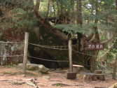 大きな岩がいくつも並んでいる坂道を登る。 見事な大岩にはそれぞれ名前がついていて、 ぐるっとひと回りして見学できる道ができている。 急な道を少し登るとすぐ、たらたら道となり、 もう?と思うほど早く「天の岩戸」に到着。 |