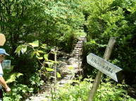 林道終点 ここから壊れそうな橋を渡って 細い登山道になる 以前は立派な橋だったそうだが 意外と老朽化が早い・・・と加藤律さん |