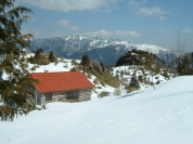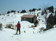 何度も四つんばいになって 木の下を潜ったり 木の上をまたいだりして あの稜線まで登れば小屋が見える ・・・という鞍部までやっと来た あと少し! 何度も足の付け根まで落ちては 足を引っ張り上げやっと見えた! 避難小屋! 小屋の前には多数の足跡が残っている 蘭からの登山者の方が多いようである |