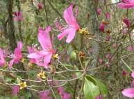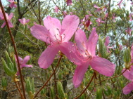 あれ?変わったミツバツツジ?? と思って眺める 今までとは、花の形・色・咲き方が 微妙に違うように感じられる・・・ |